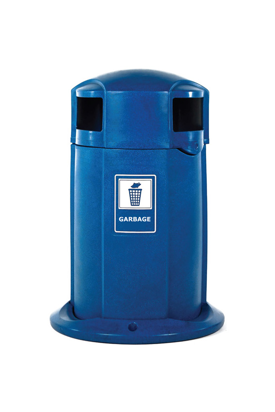 45 Gallon receptacle provides durability on roadsides & spaces with high pedestrian traffic. 3 opening domed lid prevents snow & potential waste buildup. Weight: 66 lbs.